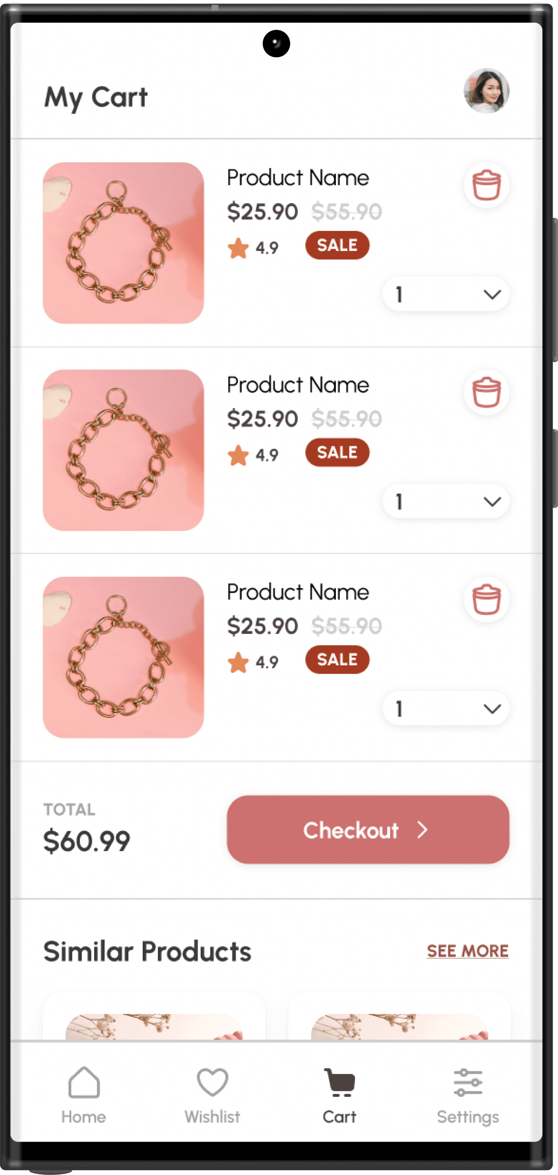 In the cart and checkout process, users can adjust product quantities, remove items, and review their order details. Changes in the payment UI design were implemented for a smoother final order process, and a section displaying similar products was added to encourage further exploration before completing the purchase.