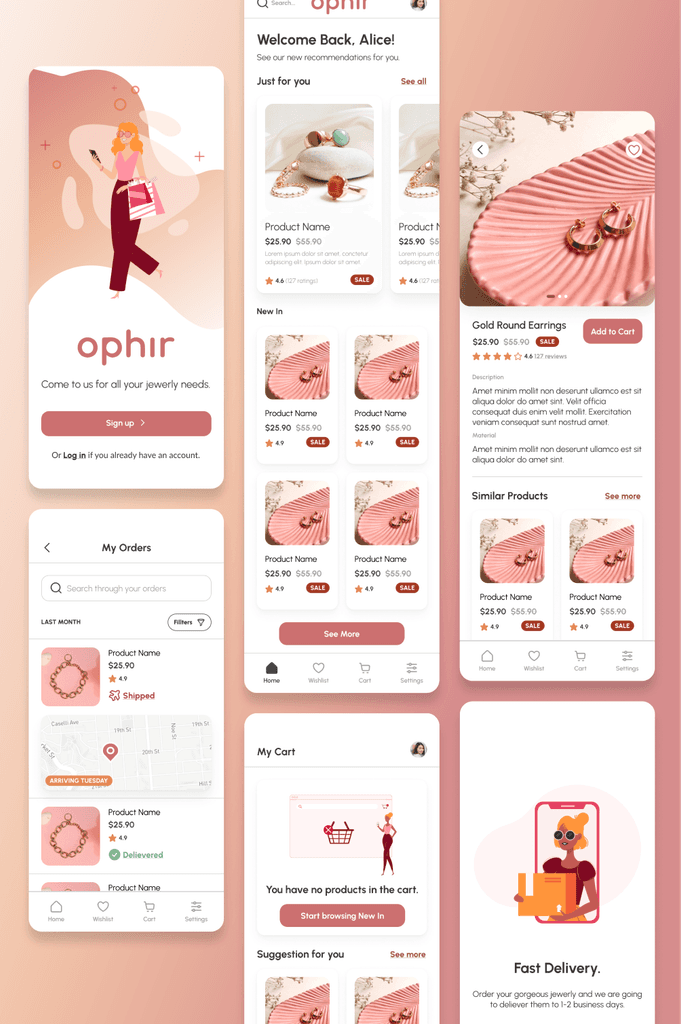 Based on the user research, the analysis and testing the final prototypes of the jewerly app were created.